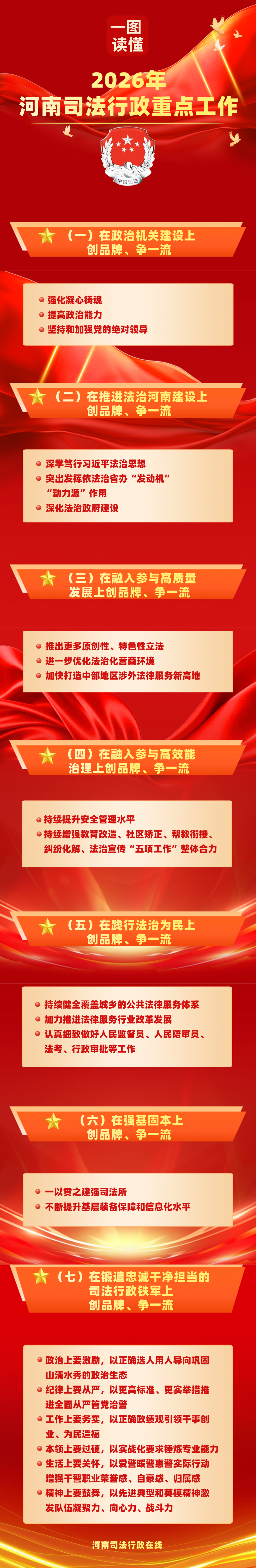 2026年是全省司法行政工作“品牌建设年”,总体要求是:坚持以习近平新时代中国特色社会主义思想为指导,全面贯彻党的二十大和二十届历次全会精神,认真落实四中全会部署,深入学习贯彻习近平法治思想和习近平总书记关于中央全面依法治国工作重要指示、在河南考察时重要讲话精神,深刻领悟“两个确立”的决定性意义,增强“四个意识”、坚定“四个自信”、做到“两个维护”,坚持和加强党的绝对领导,全面贯彻落实《中共中央、国务院关于加强新时代司法行政工作的意见》,聚焦“1+2+4+N”目标任务体系,进一步树牢“大司法行政”理念,凝心聚力、拼搏进取,加快推动全面依法治省和司法行政工作全方位、各领域创亮点创特色创品牌,更加有力有效融入参与高质量发展、高效能治理,为建设更高水平的法治河南平安河南、谱写中原大地推进中国式现代化新篇章作出司法行政贡献。